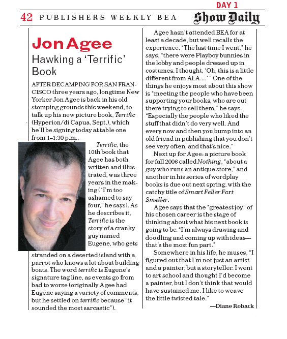 "Glass-half empty Eugene is stranded on an island with a parrot: " 'Terrific . . .What good is a parrot?' 'You'd be surprised,' said the parrot." Readers will be surprised, too, for TERRIFIC is one terrific book. Agee uses tone, pacing, and deadpan humor to great effect; his masterful illustrations beg to be shared with a group."
